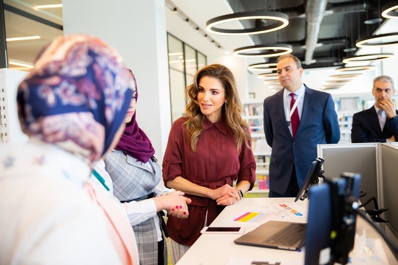 Queen Rania was stylish with JOSEPH linn rayon stripe trousers and JENNIFER CHAMANDI lorenzo burgundy multi-textured pumps.